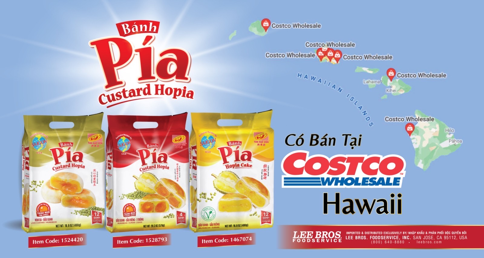 Bộ ba sản phẩm của công ty Tân Huê Viên bao gồm: bánh Pía kim sa, bánh Pía đậu sầu riêng mini và bánh Pía đậu sầu riêng hai trứng đã có mặt tại 7 nhà kho Costco của tiểu bang Hawaii nước Mỹ.