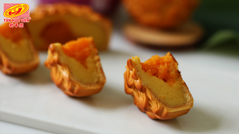 Đậu xanh xay nhuyễn nằm giữa lớp vỏ và nhân bánh khiến bánh thêm phần bùi béo, thơm ngon hơn.