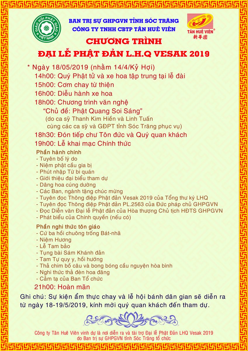 Ngày 18/05/2019 (nhằm ngày 14 tháng 04 âm lịch năm Kỷ Hợi), công ty Tân Huê Viên vinh dự là nơi diễn ra và tài trợ Đại Lễ Phật Đản Liên Hiệp Quốc Vesak 2019 tại Việt Nam do Ban Trị Sự Giáo Hội Phật Giáo Việt Nam tỉnh Sóc Trăng tổ chức.