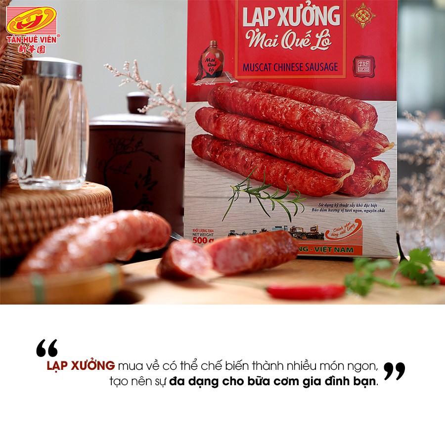 Hiện tại, công ty Tân Huê Viên cho ra thị trường nhiều món lạp xưởng như: Lạp xưởng Mai Quế Lộ, Lạp xưởng Mai Quế Lộ vị tiêu, Lạp xưởng tôm, Lạp xưởng gà, Lạp xưởng bò, Lạp xưởng xông khói, Lạp xưởng trứng muối, Lạp xưởng tươi, Lạp xưởng hồ lô... với chất lượng thơm ngon và mẫu mã đẹp. Quý khách mua lạp xưởng về để làm phong phú thêm bữa ăn cho gia đình bạn, tặng người thân điều rất thích hợp. Sản phẩm được bán tại Quầy hàng Tân Huê Viên và các đại lý của công ty.