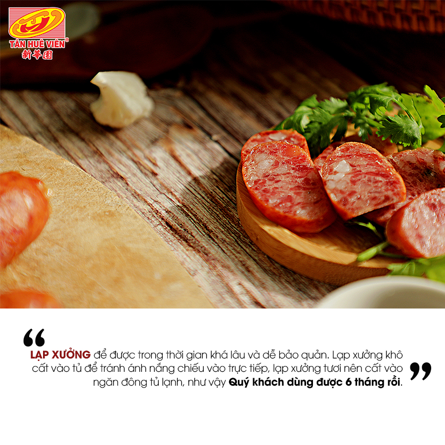 Hiện tại, công ty Tân Huê Viên cho ra thị trường nhiều món lạp xưởng như: Lạp xưởng Mai Quế Lộ, Lạp xưởng Mai Quế Lộ vị tiêu, Lạp xưởng tôm, Lạp xưởng gà, Lạp xưởng bò, Lạp xưởng xông khói, Lạp xưởng trứng muối, Lạp xưởng tươi, Lạp xưởng hồ lô... với chất lượng thơm ngon và mẫu mã đẹp. Quý khách mua lạp xưởng về để làm phong phú thêm bữa ăn cho gia đình bạn, tặng người thân điều rất thích hợp. Sản phẩm được bán tại Quầy hàng Tân Huê Viên và các đại lý của công ty.