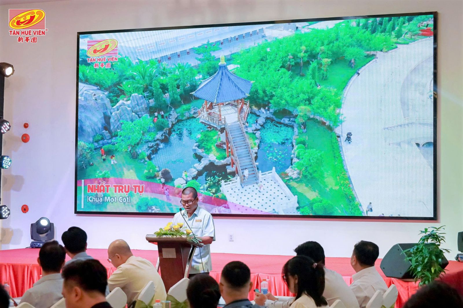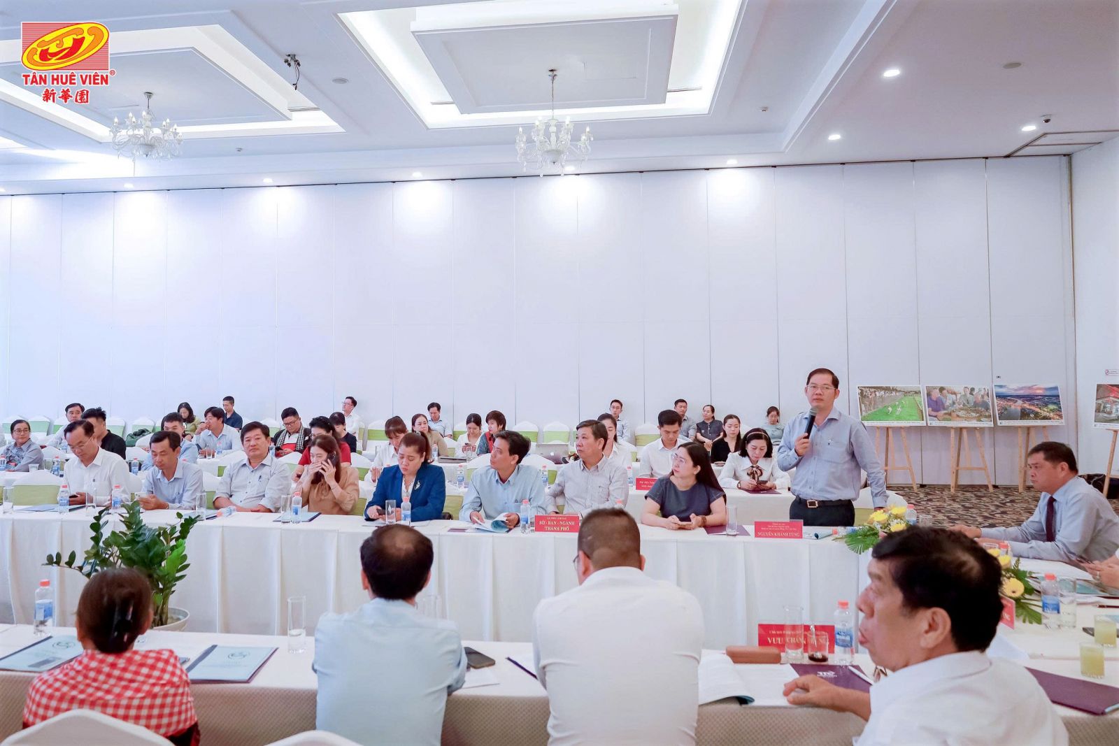 Đại diện Công ty Tân Huê Viên, ông Quách An - Giám đốc Kinh doanh, trình bày tham luận về mô hình “Công nghiệp gắn với du lịch - phát triển điểm đến Tân Huê Viên thành điểm du lịch đặc trưng”, nhấn mạnh tiềm năng kết hợp sản xuất, ẩm thực và trải nghiệm văn hóa để tạo sản phẩm du lịch đặc sắc cho vùng.