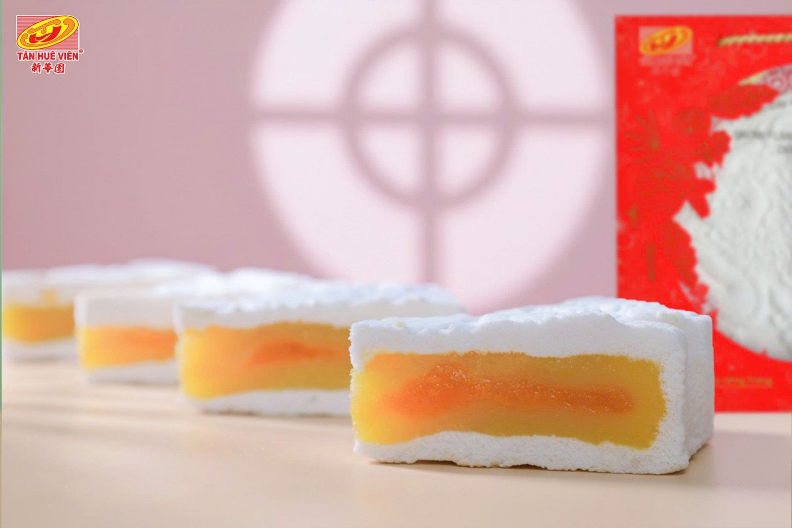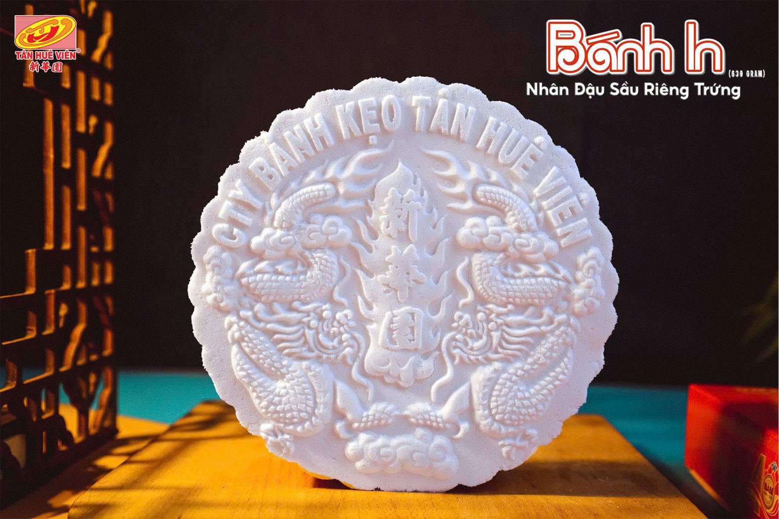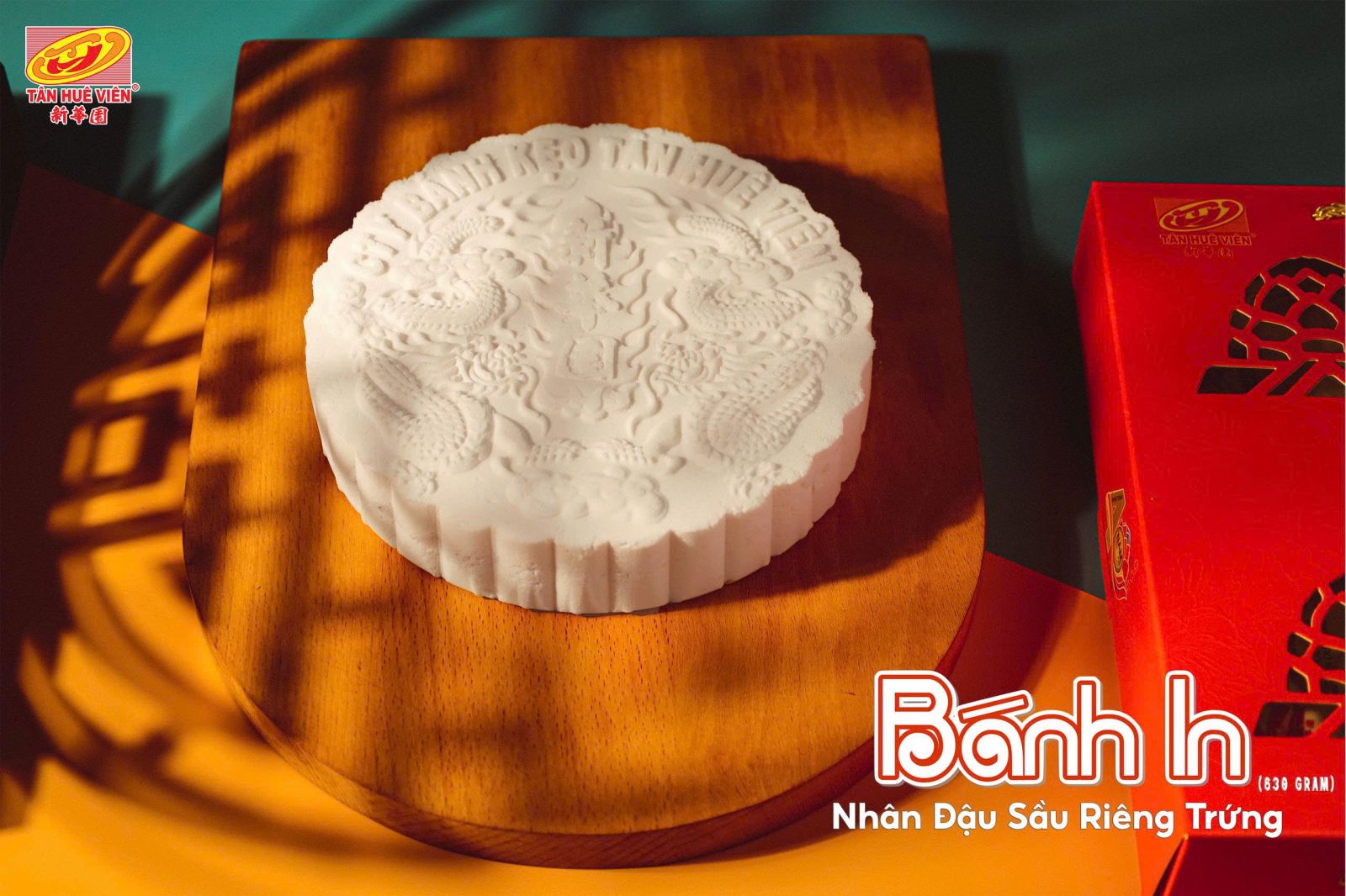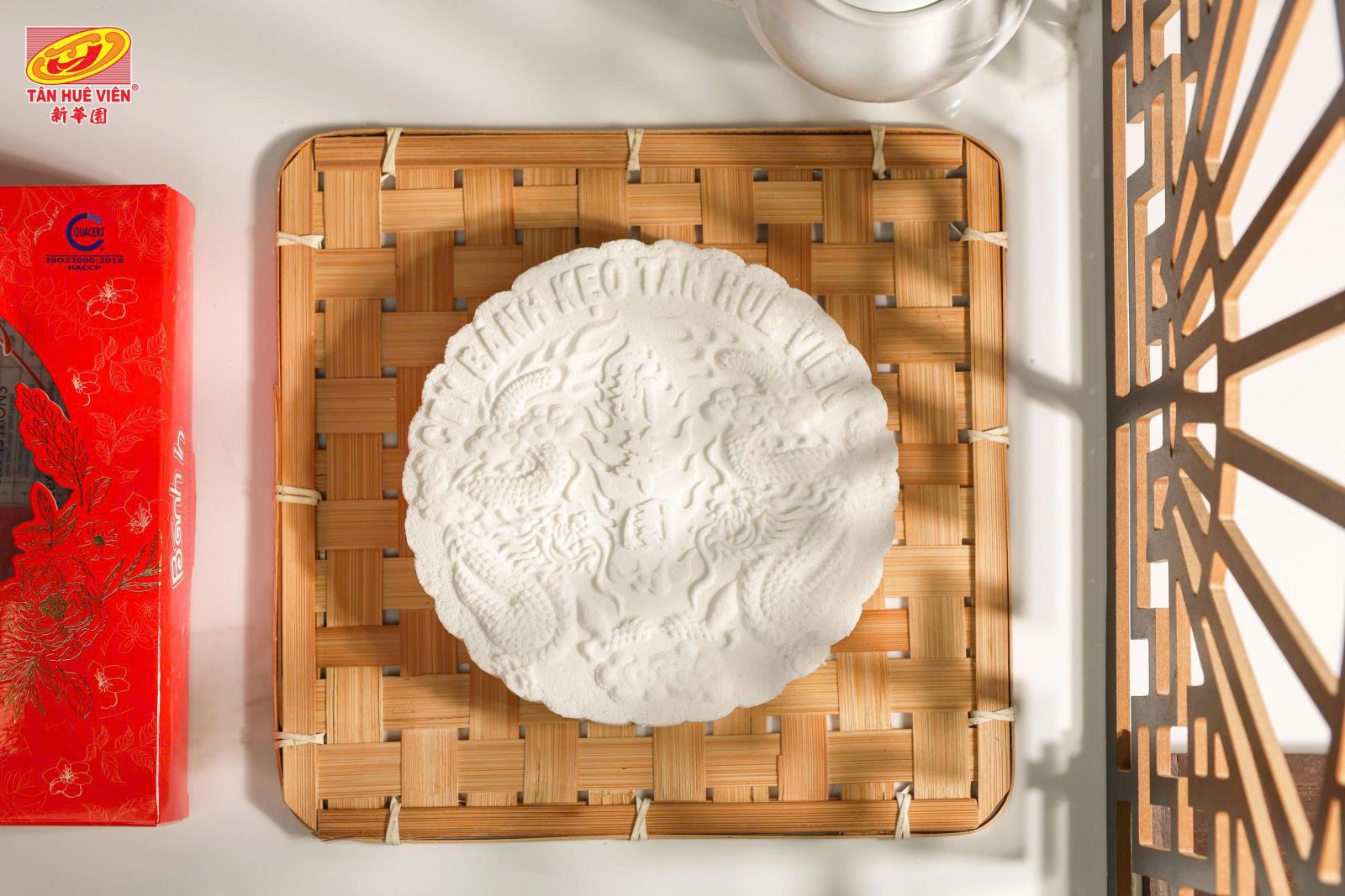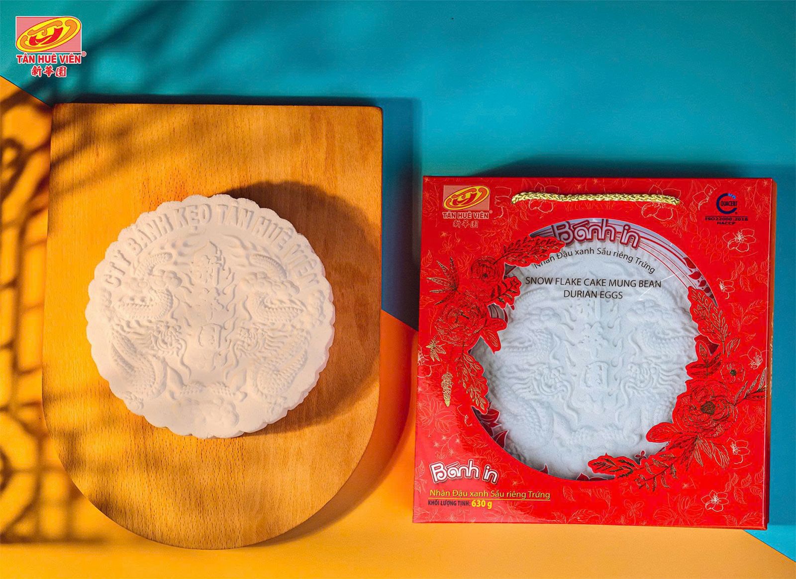 Ngày nay, Tân Huê Viên mang đến một làn gió mới cho chiếc bánh quen thuộc ấy khi biến tấu thêm nhân trứng muối để tạo ra chiếc bánh In đậu xanh trứng muối với trọng lượng 630g. Vẫn giữ nguyên nét mộc mạc của lớp bánh trắng tinh khôi, nhưng khi cắn vào, vị ngọt bùi của đậu xanh bỗng hòa quyện cùng chút béo bùi, mằn mặn của trứng muối và thoảng hương sầu riêng, tất cả tạo nên một sự kết hợp đầy bất ngờ.