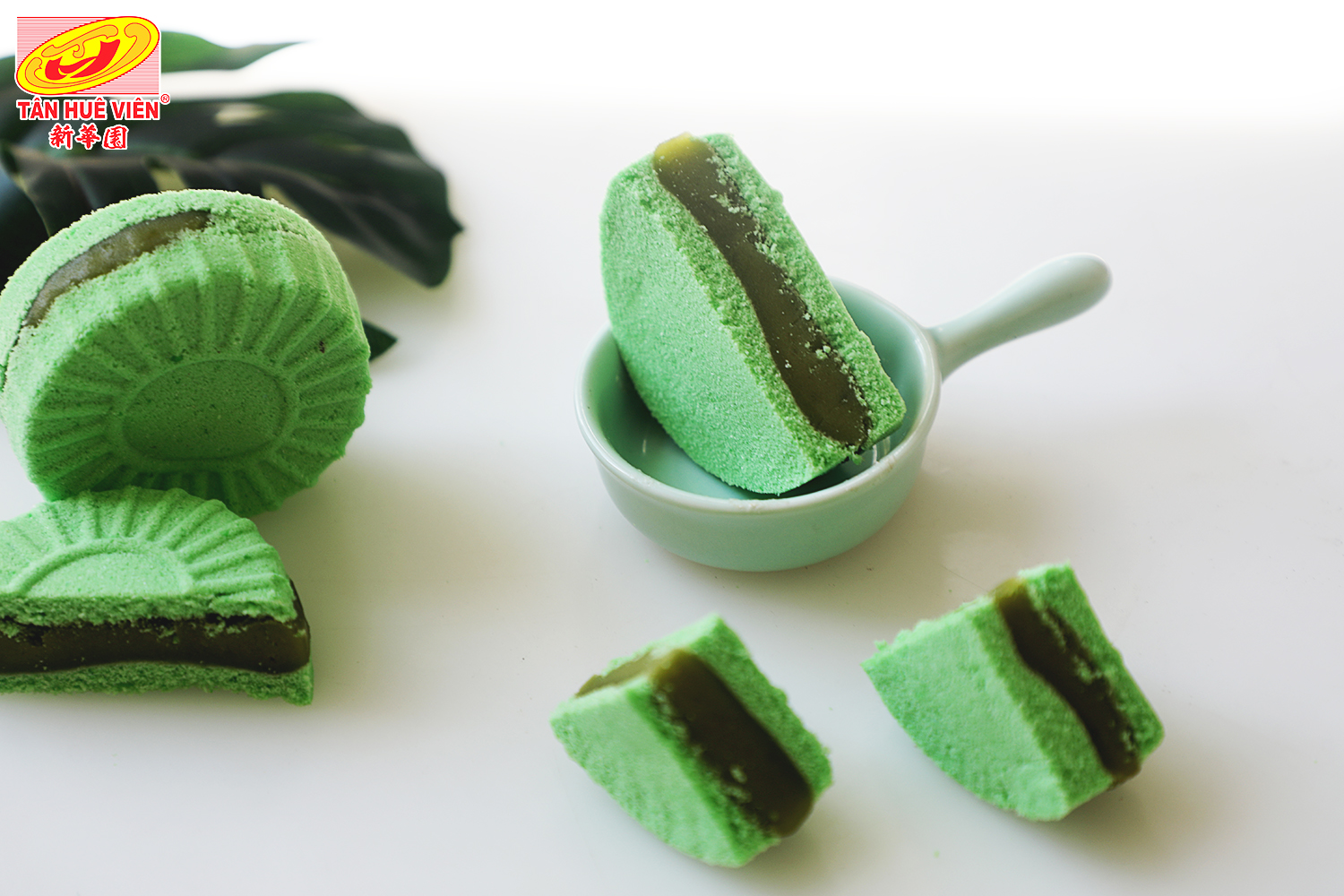 Bánh in trà xanh Tân Huê Viên gây ấn tượng không kém khi vẻ ngoài của bánh toát lên một màu xanh nhẹ, chất lượng bánh cuốn hút, ăn một lại muốn ăn thêm hai.