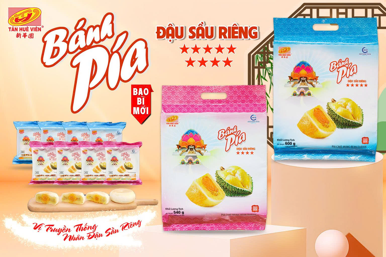 Năm nay, Tân Huê Viên chính thức ra mắt bao bì mới cho dòng sản phẩm Bánh Pía đậu xanh sầu riêng trứng muối 4 sao và 5 sao.