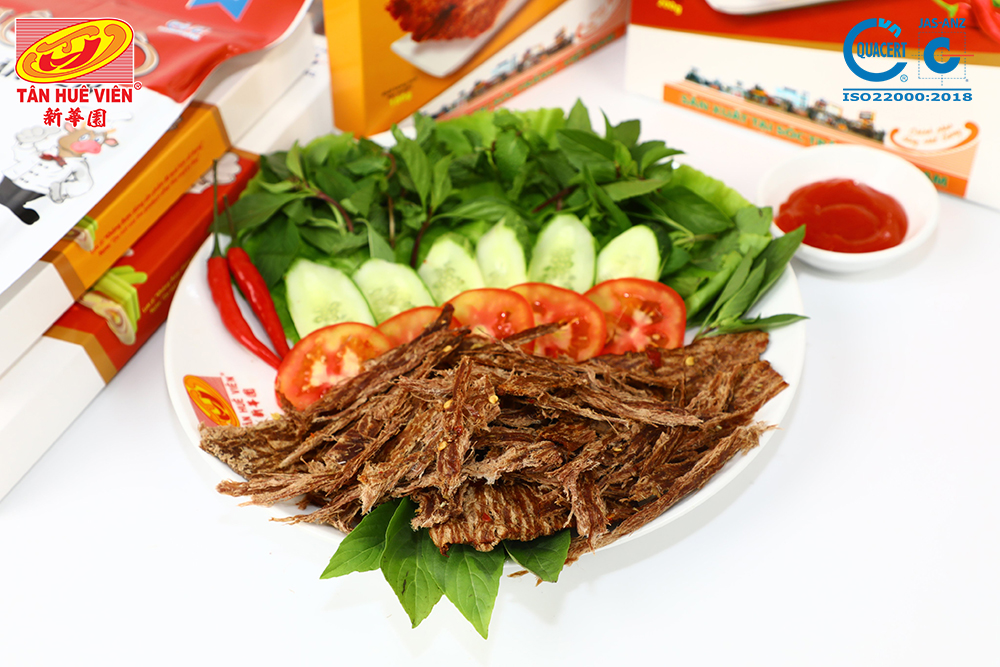 Khô bò là món ăn vặt yêu thích của nhiều đối tượng khách hàng. Khô bò Tân Huê Viên được làm từ thịt bò tươi và tẩm ướp gia vị đậm đà mang lại cảm giác cay cay, thơm thơm từ lần đầu thưởng thức.