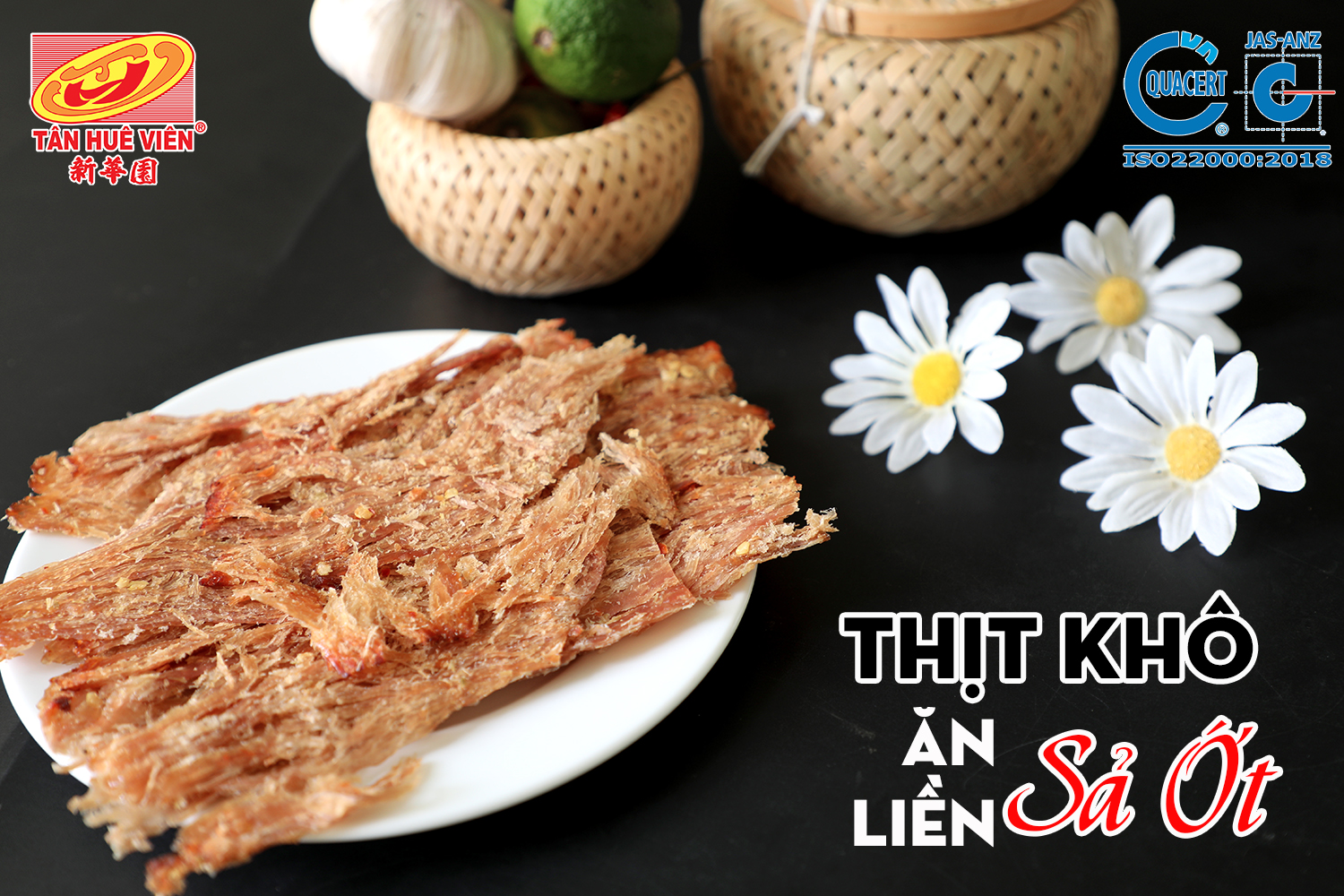 Dựa trên những lợi ích thiết thực mà thịt heo mang lại Tân Huê Viên đã nghiên cứu và cho ra đời sản phẩm Thịt Heo Khô Sả Ớt. Sử dụng công nghệ sấy khô hiện đại đảm bảo thịt được sấy khô hoàn toàn và đạt tiêu chuẩn an toàn vệ sinh thực phẩm.